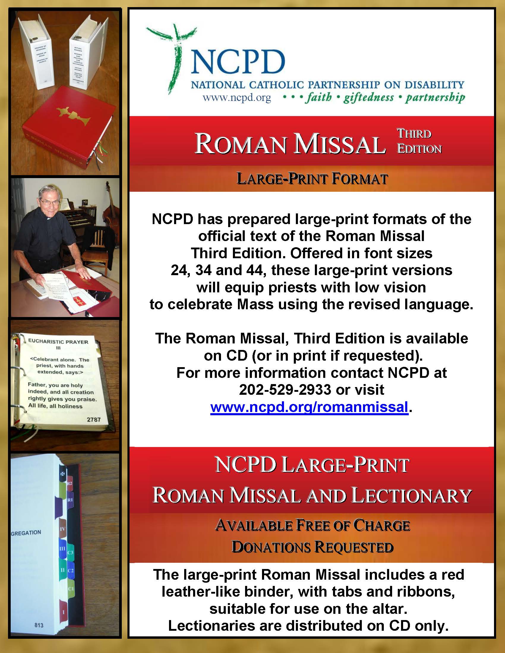 NCPD distributes large-print formats of the official text of the Roman Missal Third Edition to priests with low vision to help them celebrate Mass. We offer font sizes 24, 34 and 44.